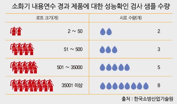 성능검사를 위한 시료는 적게는 2개부터 최대 8개가 필요하다. 내용연수가 경과한 소화기가 2~50개의 경우 2개, 51~500개는 3개, 501개~35000개는 5개, 35001개 이상이면 8개의 소화기 시료를 검사 받아야 한다.